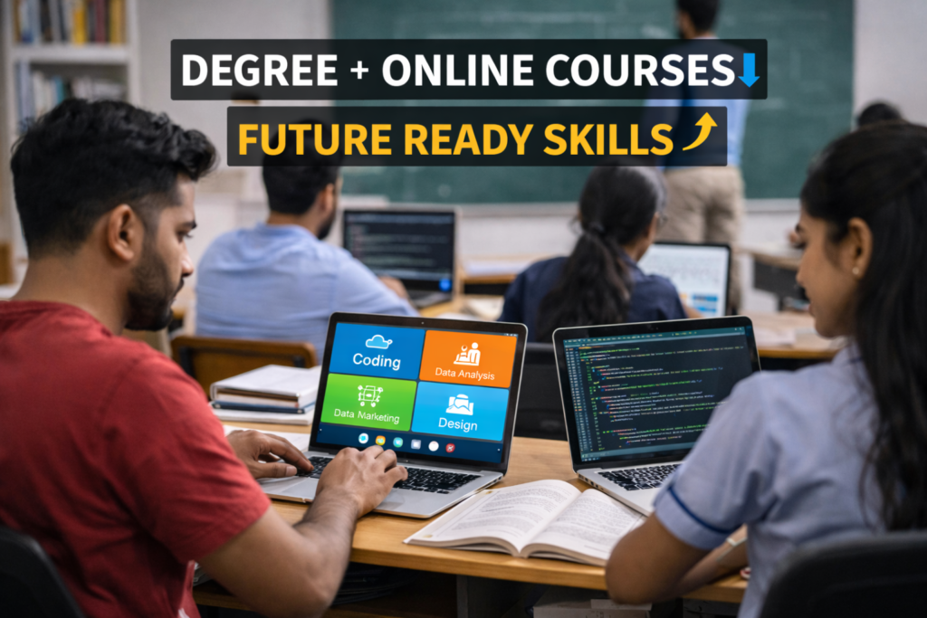 आज कल छात्र ग्रेजुएशन के साथ-साथ ऑनलाइन कोर्स भी कर रहे हैं – कोडिंग, डिजिटल मार्केटिंग, ग्राफिक डिजाइन, एआई टूल्स, वीडियो एडिटिंग और डेटा एनालिसिस जैसे फील्ड्स में डिमांड तेजी से बढ़ रही है।